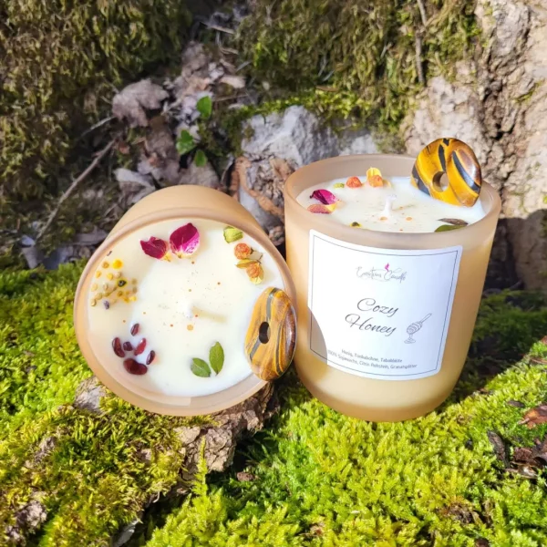 Entdecke unsere Duftkerze Cozy Honey mit einem himmlischen Honigduft, einem Hauch von Tonkabohne und Tabakblüte aus reinem Sojawachs für mehr positive Energie und Entspannung Pur in Deinem Alltag.