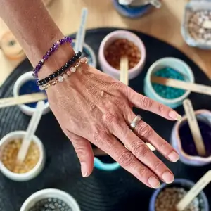 Materialien: Es steht dir eine große Auswahl an Edelsteinperlen in verschiedenen Farben und Bedeutungen zur Verfügung. Zusätzlich kannst du – je nach Workshop-Paket – aus verschiedenen Zwischenelementen wie Kugeln, Sternen oder kleinen Anhängern wählen. Alle Armbänder werden auf hochwertigem elastischem Schmuckband gefertigt.