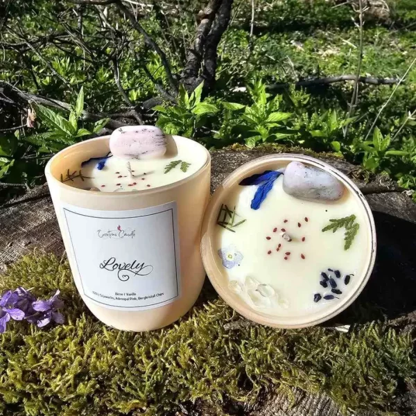 Die besondere Kristallkerze ist liebevoll mit Blüten dekoriert und besteht aus reinem Sojawachs. Mit LOVELY schaffst Du eine romantische Atmosphäre. Genieße den beruhigenden Schein des Kerzenlichts und die positiven Energien.