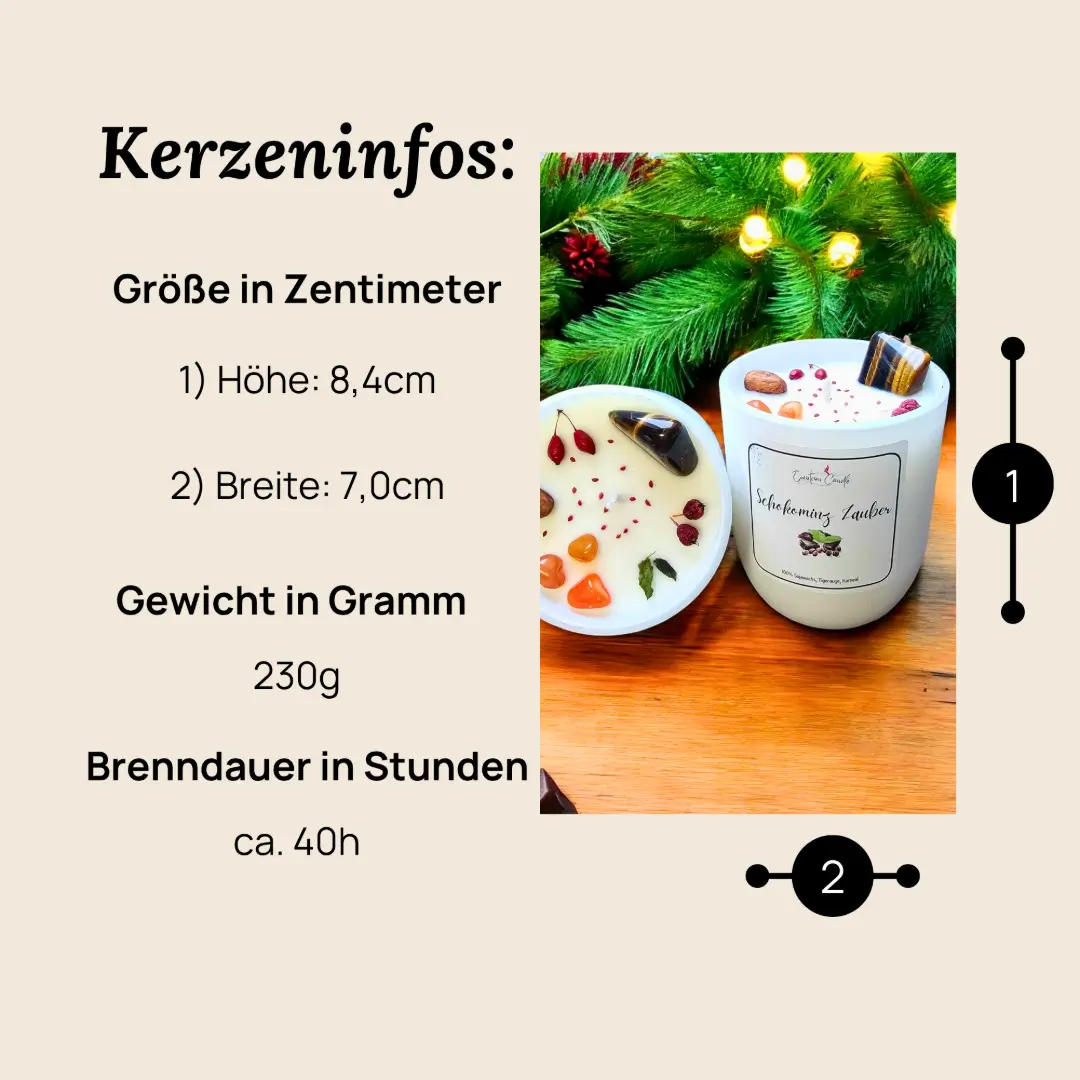 Diese besondere Kristallkerze verbindet die Leichtigkeit von Minze mit der Wärme von Schokolade – wie ein Spaziergang im Winter mit einer heißen Tasse Kakao in der Hand. Sie weckt Erinnerungen, beruhigt das Nervensystem und schenkt dir achtsame Genussmomente – ganz ohne Kalorien, aber mit ganz viel Genuss & Gefühl.