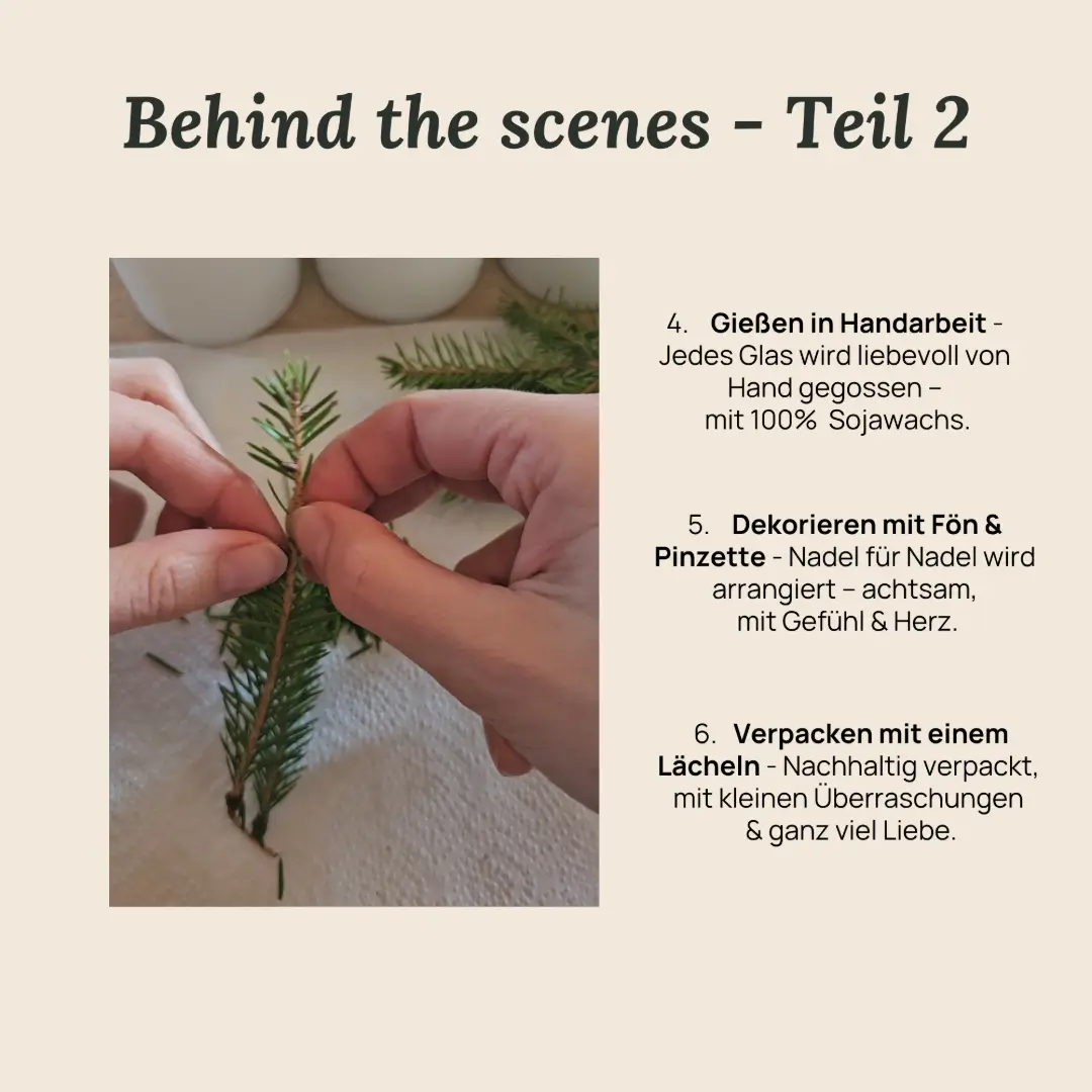 Viele der Elemente in meinen Kerzen beginnen nicht am Arbeitstisch – sondern draußen. Beim Streifen durch den Wald, wenn ich Tannennadeln aufhebe, kleine Zapfen entdecke oder Blüten zwischen den Fingern drehe.