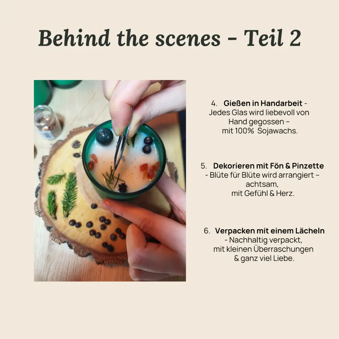 Die mit Sorgfalt gesammelten und getrockneten Blüten unterstützen nicht nur die Energie der Kerze, sondern machen sie auch optisch zu einem kleinen Kunstwerk in deinem Heim.